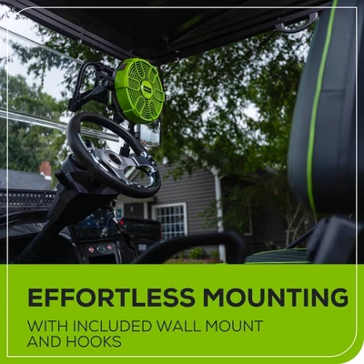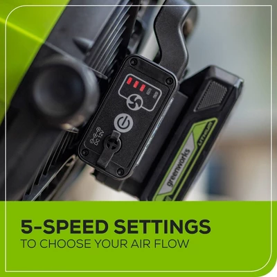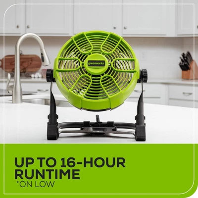 The Greenworks 10” Fan utilizes 24V DC / 120V AC Power that offers a hybrid power source to provide all day run-time in the garage, around the house, outdoors, or on-the-go! The Greenworks 24V Cordless Fan offers 5 variable speed settings so you can easily switch between high, medium and low fan settings for customizable air flow. The Greenworks Cordless Fan offers up to 16 hours of run time on low, and up to 4 hours of run time on high with the included 2.0 Ah Battery, allowing you to use this fan all day.This fan features a 360° Pivoting Head to direct airflow and allows for optimal control. This Tool is part of the Greenworks 24V PowerAll Family of over 125+ Cordless Indoor and Outdoor Products that all work on the same battery platform (Lawn & Garden, Indoor/Outdoor Cleaning, Power Tools, Lifestyle, Power Solutions and more)!