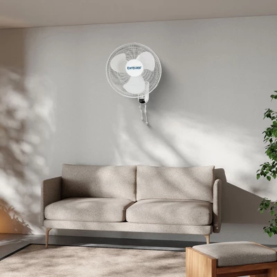 - Set of (2) classic 16-inch wall mount oscillating fans that offer a 90 degrees oscillation feature, ensuring a side-to-side movement that effectively covers wider spaces, providing a cool breeze wherever you need it