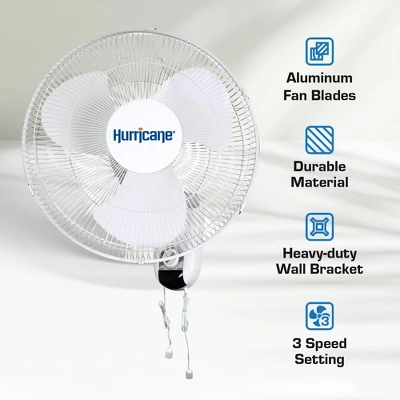 Be blown away by the reliable performance of the 2-pack of Hurricane 16-Inch Classic Corded Electric Oscillating Wall Mount Fan, your solution for powerful and space-efficient air circulation. Whether it’s your grow tents, apartments, offices, sheds, home garages, small studios, or dorms, this wall fan is designed to deliver exceptional performance. Easily install it with the included heavy-duty wall bracket and hardware, saving valuable floor space.Crafted with rugged all-metal construction and a sleek white painted finish, this fan exudes durability and style. It also features an option to lock in a static position to limit airflow to one steady direction. Take control of your comfort with the oscillating fan’s versatile features. The hanging pull cords mean you can install the fan high on the wall yet still access and control the 3-speed options. Choose from 3 speed settings, allowing you to tailor the airflow to your preference. The 90-degree oscillation controls a customizable experience, ensuring every corner of your space receives optimal ventilation. The included 5-foot, 120-volt power cord adds convenience, giving you flexibility in placement. Enhance your environment with the 2-pack of 16-Inch Classic Corded Electric Oscillating Wall Mount Fan from Hurricane where performance, durability, and versatility converge for superior air circulation in any space.