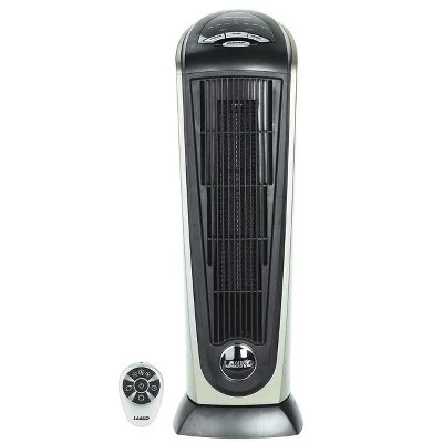 The Lasko Ceramic Tower Heater with remote control provides effective heating for most rooms in your home. An elongated heating element, penetrating air velocity, and widespread oscillation work together to deliver all-over warmth for total comfort. This ceramic heater also features an electronic programmable thermostat, a seven-hour timer, and two quiet comfort settings, all easily controlled with the included multi-function remote.