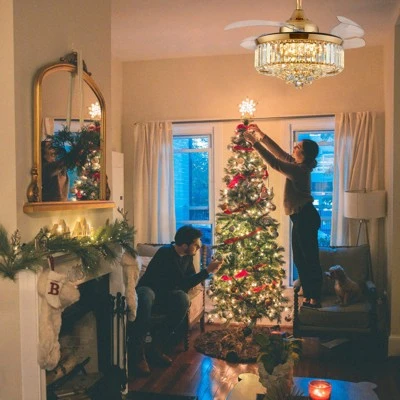 - [Crystal Ceiling Fans with Lights]Enhance your living space with the perfect combination of a crystal ceiling fan and chandelier light. This ventiladores de techo modernos chandelier ceiling fan boasts a stunning appearance and operates with a frequency motor that runs in complete quiet. The crystal invisible fandelier features a two-layer crystal shade and four retractable fan blades, adding a touch of elegance to any room.