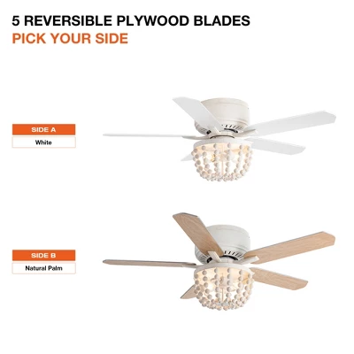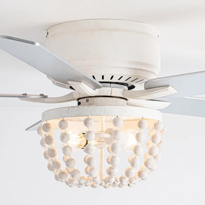 This beautiful 48-inch White Farmhouse Flush Mount Ceiling Fan is the perfect blend of style and functionality. The boho fan comes with a remote control, allowing you to adjust the fan speed and light on/off settings from anywhere in the room. This low profile ceiling fan features a reversible motor, which lets you change the direction of the fan from downdraft mode during the summer to updraft mode during the winter. The standout feature of this ceiling fan is its unique wood bead shade. This design element adds a touch of rustic charm to the fan, making it an attractive centerpiece in any room. The shade also diffuses the light from the bulbs, creating a warm and inviting ambiance.