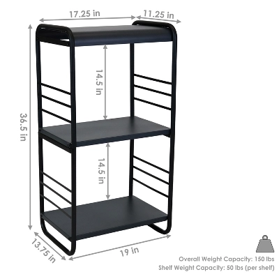 - • GREAT SIZE FOR LOG STORAGE: This storage rack measures 19″ W x 13.75″ D x 36.5″ H and weighs 20 lbs. The height from the ground to bottom shelf is 3″. The clearance height between the bottom and middle shelf is 14.5″. The clearance between the top shelf and the overhead cover is 14.5″. Each shelf is 19″ W x 12.25″ D x 2 mm. The overhead cover is 17.25″ W x 11.25″ D. Each shelf has a 50 lb weight capacity and the overall unit has a weight capacity of 150 lbs.