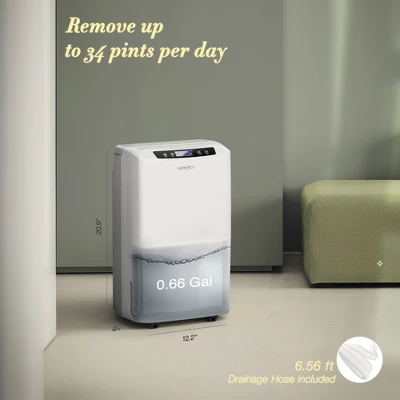 - High Capacity: Removes up to 34 pints daily in spaces up to 2,000 sq. ft.