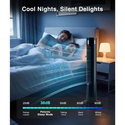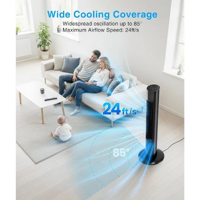 Stay comfortably cool with this powerful 36-inch oscillating tower fan that delivers instant cooling throughout your space.Its 85° wide-angle rotation and high-speed 24ft/s airflow create a refreshing breeze perfect for any room. Choose from 3 speed settings and 3 modes (Normal/Sleep/Natural) .All easily controlled with the included remote.The fan operates at just 36dB thanks to its innovative air-duct system, while the 12-hour timer ensures automatic shut-off for undisturbed sleep.